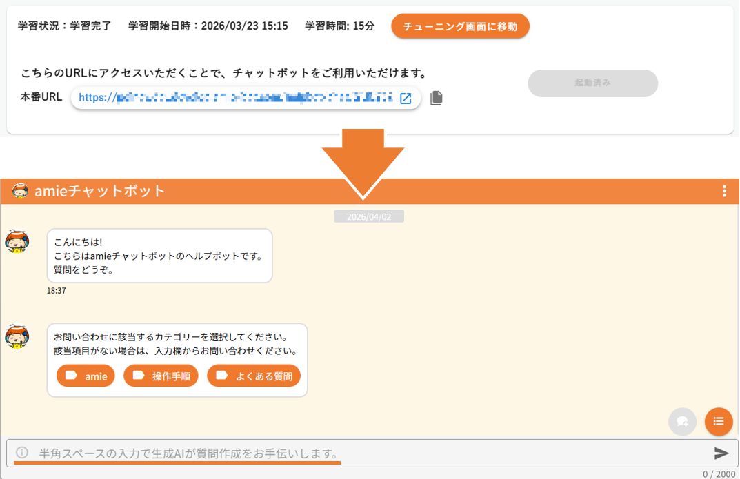 入力画面の文言が「質問を入力してください。」→「半角スペースの入力で生成AIが質問作成をお手伝いします。」に変更されていることを確認します。