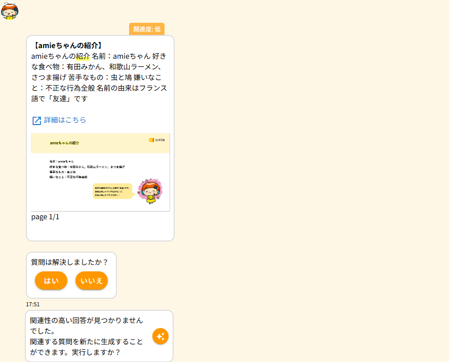 - 質問に対し、未回答の場合や関連度の低い回答が表示された場合に、質問生成を提案します。