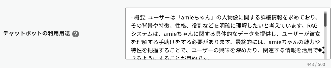 利用用途を入力すると、その内容が質問生成のプロンプト内で参照され、