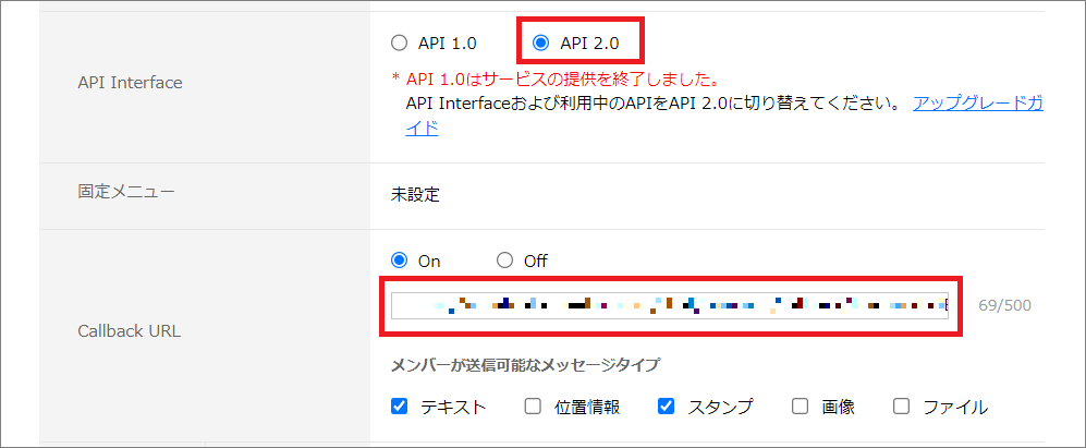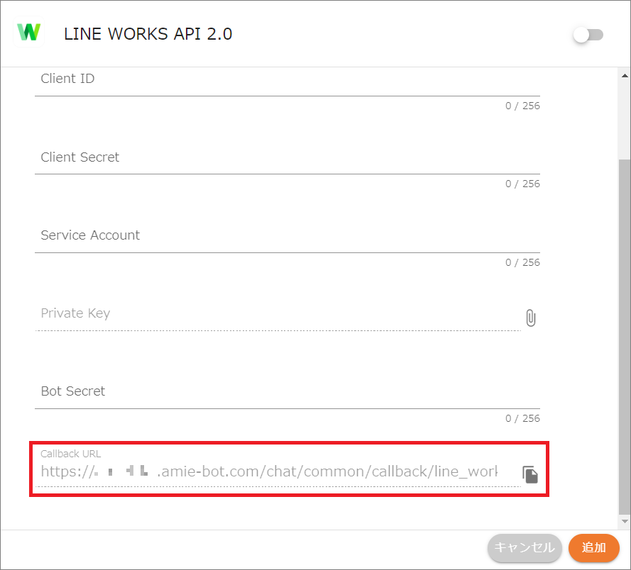 [Callback URL]に、amie HelpBotの基本設定「LINE WORKS API2.0」の[Callback URL]に表示されているURLをコピーします。