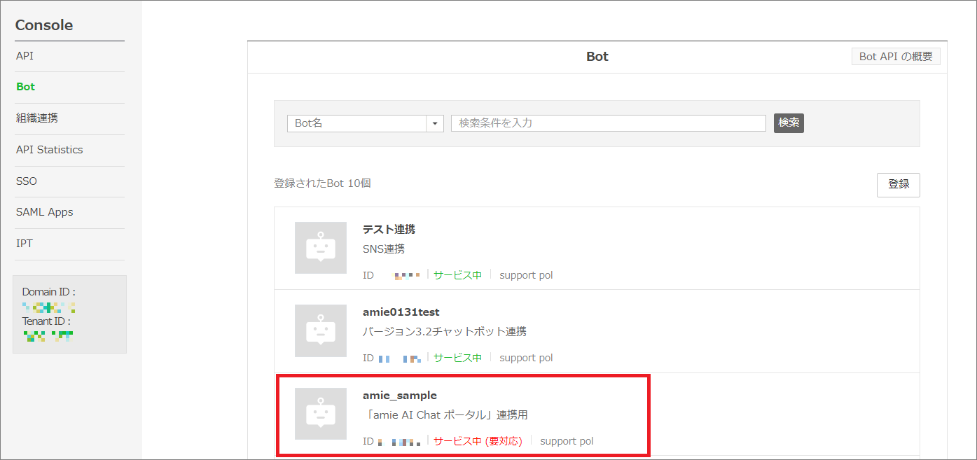 1. Developer Consoleへアクセスし、Bot一覧画面を表示から対象のBotをクリックします。