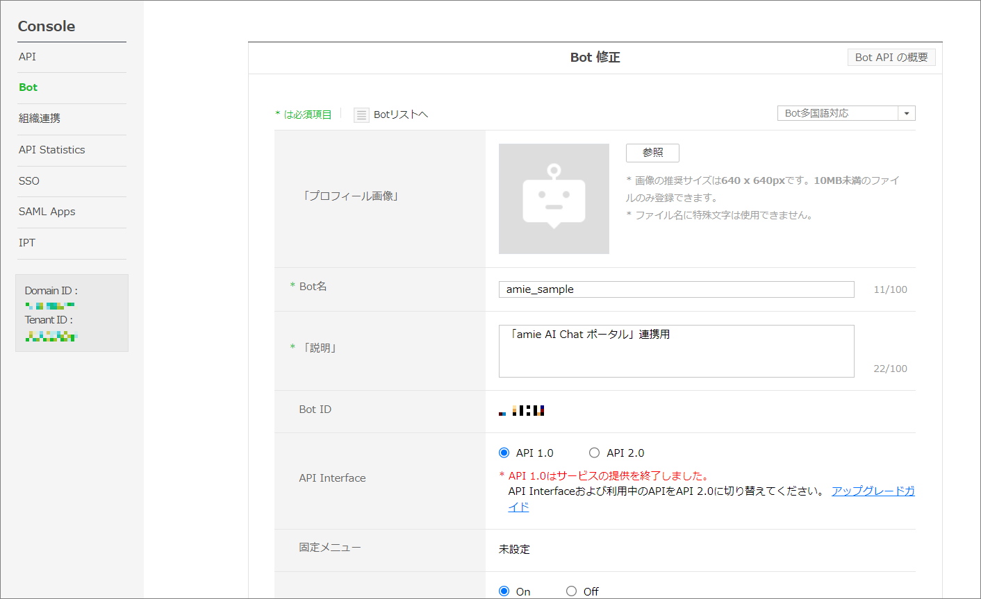 5. amie HelpBotの基本設定で「LINE WORKS」をOFFにし、「LINE WORKS API2.0」の各設定を登録してください。