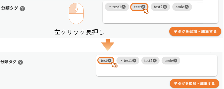 - 変更したい分類タグを選択し、スライドさせることで順番を入れ替えることができます。