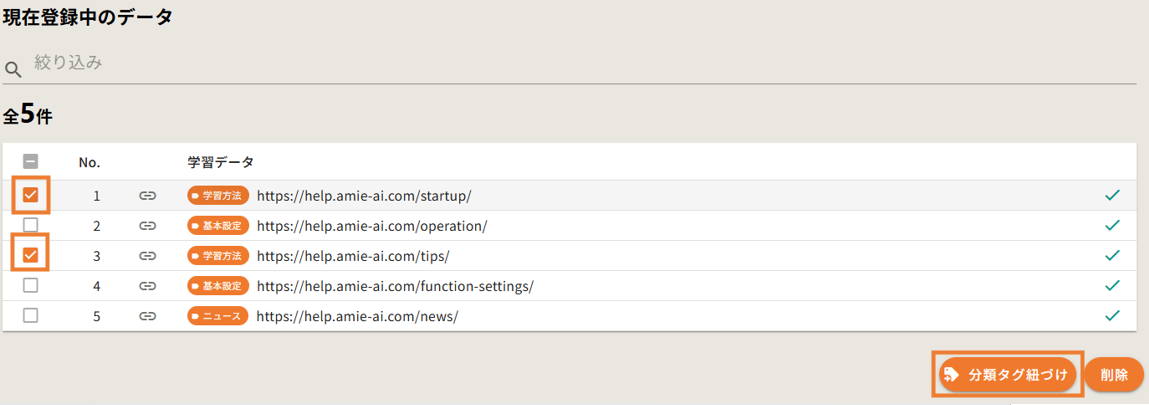 - 登録中のデータより、分類タグを削除したいデータを選択し、右下の「分類タグ紐づけ」をクリックします。