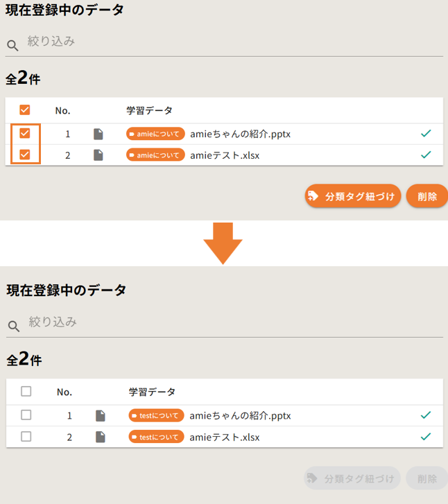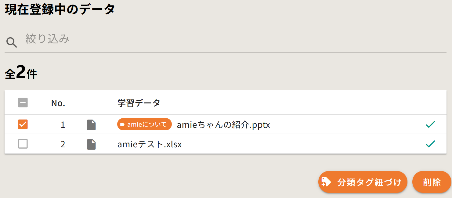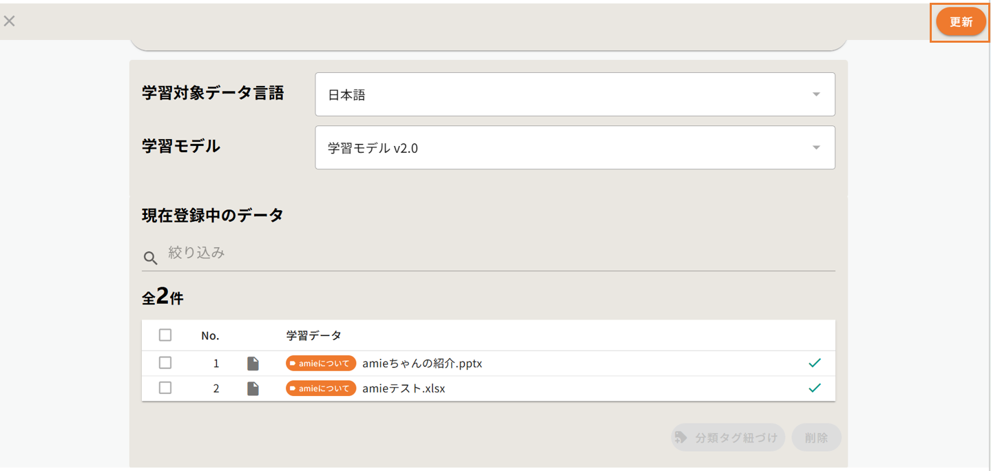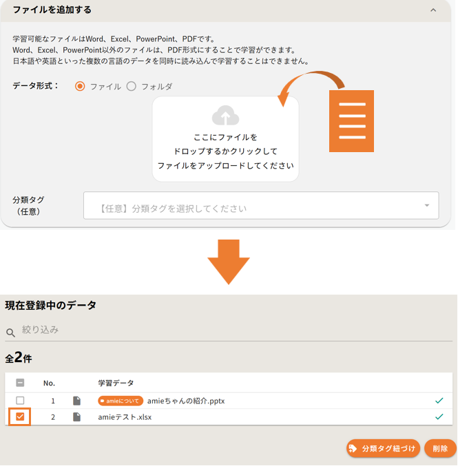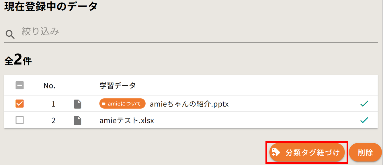 ファイルを追加せず、「現在登録中のデータ」の該当ファイルのみにチェックを入れます。 - 「分類タグ紐づけ」をクリックします。