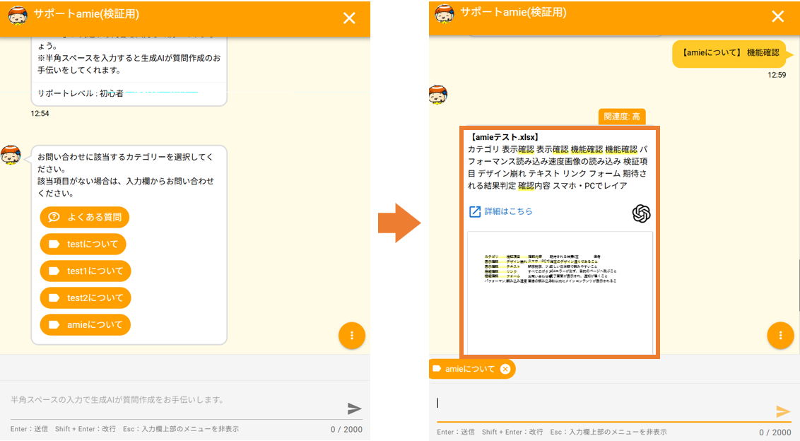 - 登録後、チャット画面にてカテゴリ選択をし、回答が表示されるか確認します。