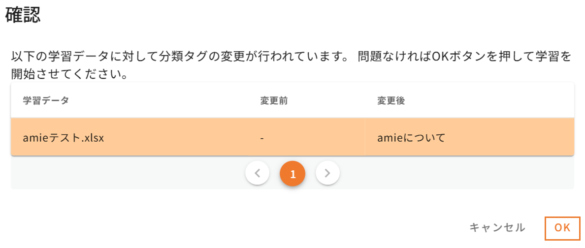 - 「確認」画面が表示されますので、変更内容を確認し「OK」をクリックすると、学習が開始します。