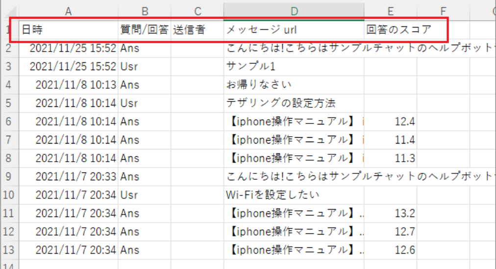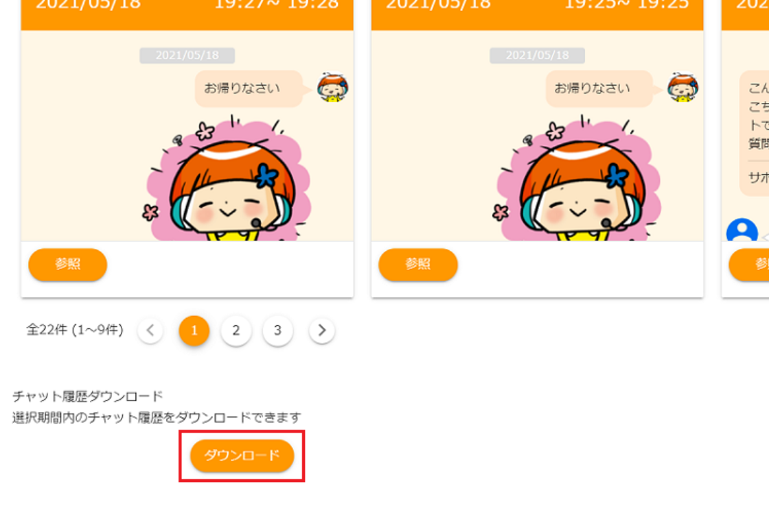 「ダウンロード」をクリックすると、チャット履歴の検索結果をcsv形式のファイルにダウンロードできます。